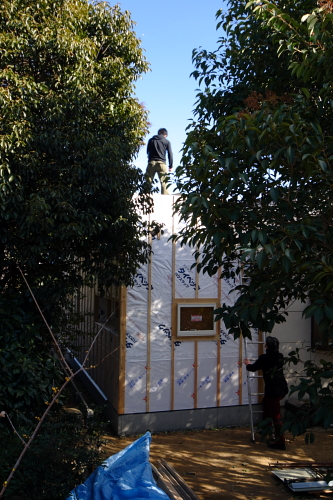 透湿防水シートも外周に張付けが終わり、通気胴縁の施工も完了。