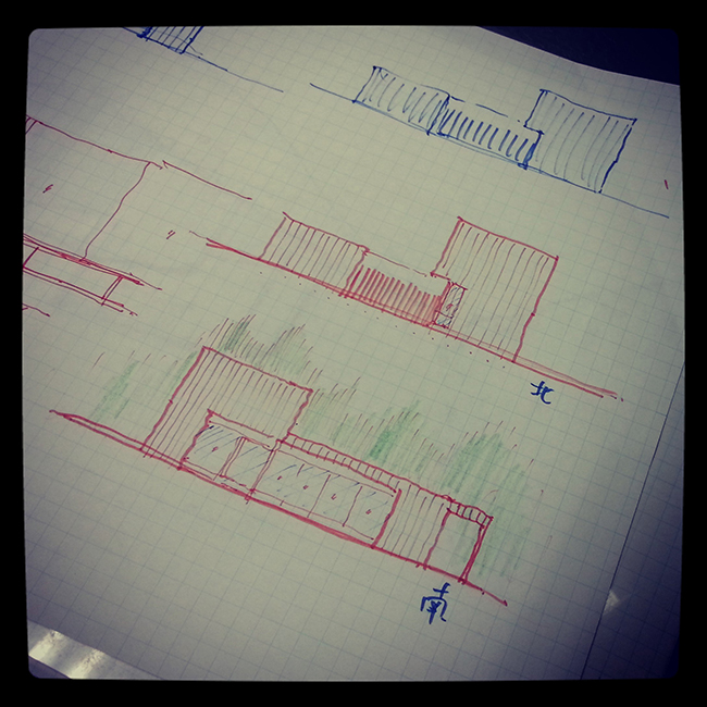 平面、配置、断面の他に4カットラフスケッチをエイジに描いてもらって色々ご提案。