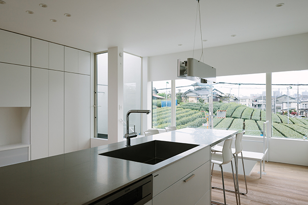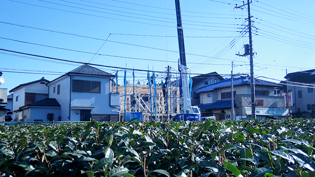 所沢市の住宅『vida』の目の前には年中緑が絶えない茶畑が広がっています。