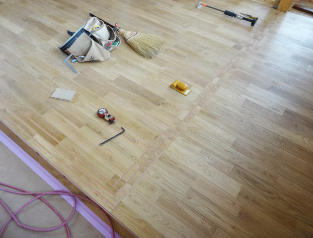 ナラのフローリングとラワン合板床の見切りのアルミアングル。