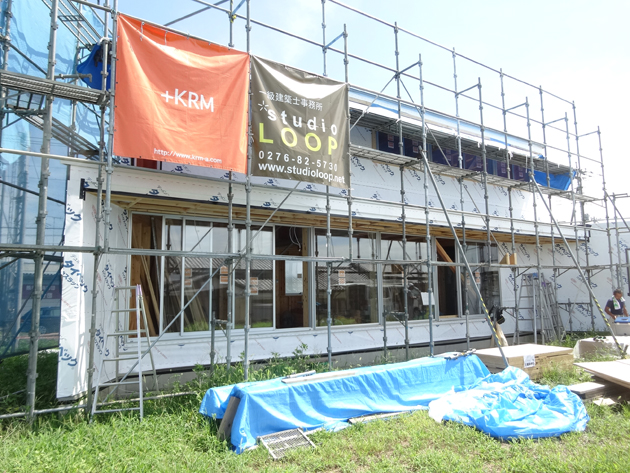 埼玉県熊谷市の住宅足場に施工会社+KRMさんと我々の旗が掲げられました。