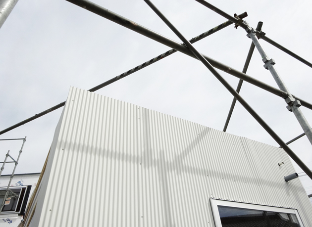1階はコーナー役物を使わないため小波を波々折り曲げて、寄せが来る部分を板金屋さんが調整してます。
