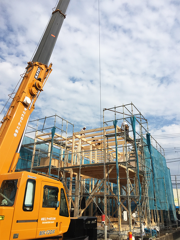 前日夜遅くまで降り続いた雨にヒヤヒヤしましたが、無事上棟を迎えることができました。
