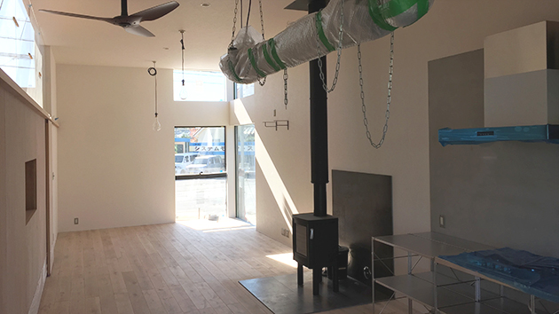 内部は床の養生もはがれ、ステンレスキッチン、薪ストーブ、LOOPではおなじみのシーリングファンも設置されました。