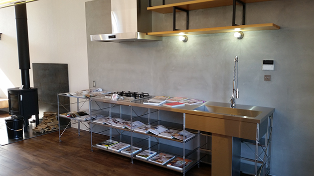 ステンレスキッチンに合わせてモルタル塗りにした壁も良い雰囲気を醸し出しています。