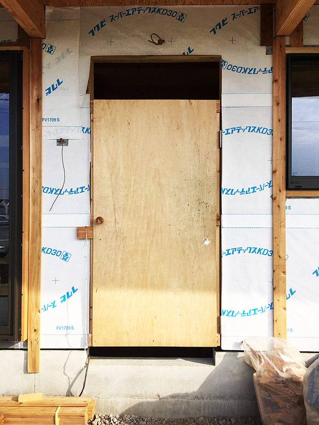 実際のドアは木製となり、工事後半戦まで設置できないため仮で作ってくれました。