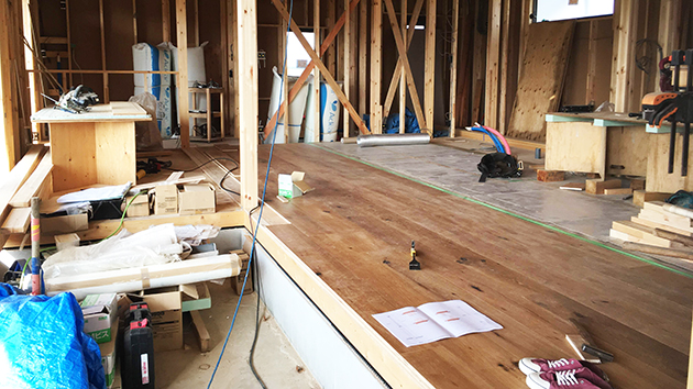 オークのフローリングも貼り終え、次は断熱、巾木、そしてボード貼りが始まります。