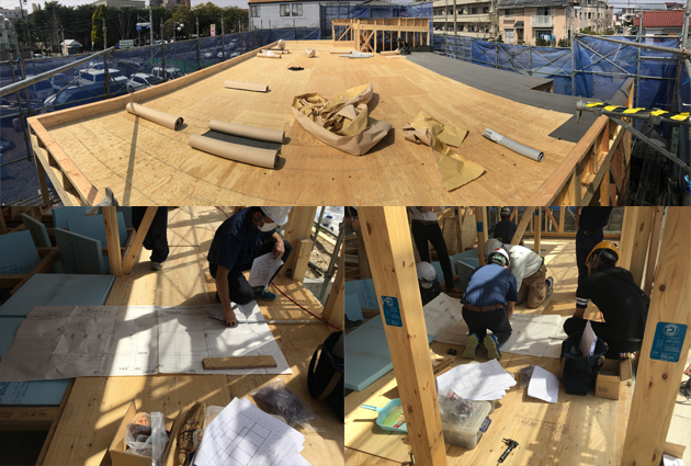 そんな中、屋根納まりを確認しに足場を登っているとお施主様も興味をもたれたので、一緒に屋根上へ。お施主様には珍しい光景ですし、この現場は平屋で足場を登って確認いただくことも少ないので、今回登って喜んで頂けて何よりでした。