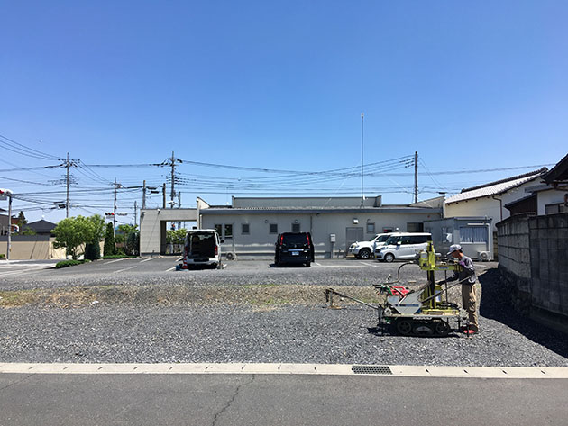 地盤調査の傍ら、ループ新兵器「回転レーザーレベル」を用いて敷地高低差を測定。