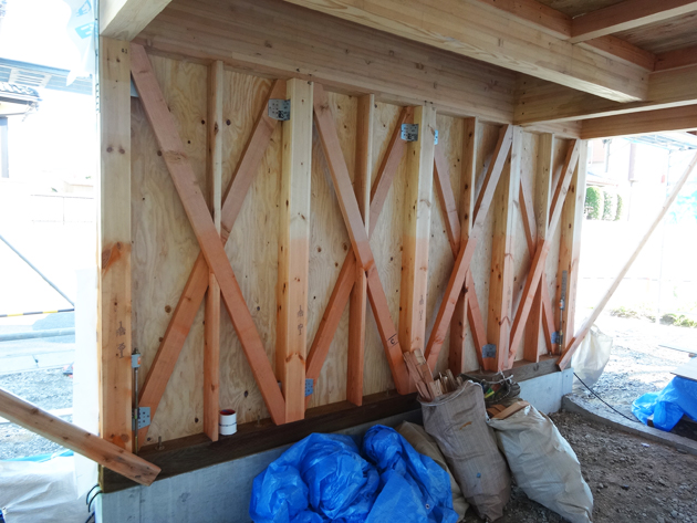 一階四隅に柱が無く浮いた外観となるため、設けられる希少壁は筋交いダブルの4連チャン。