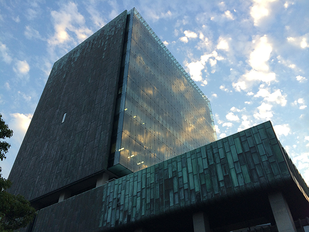 緑青仕上げのブロンズ板とガラス面の壁面との対比が印象的ですね。