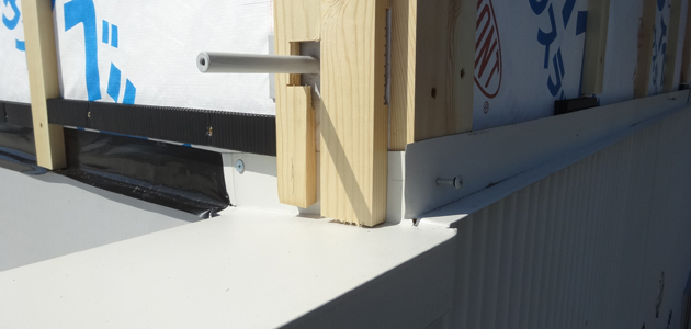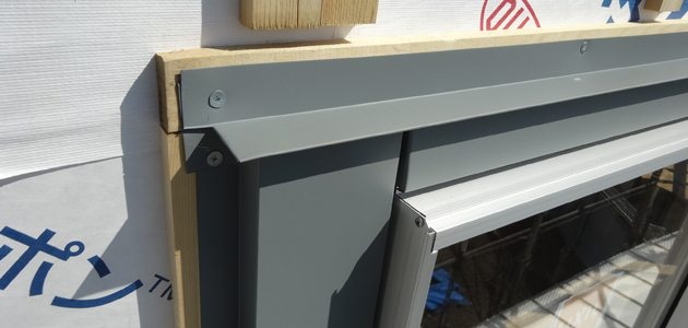 2階サッシ(木・板金工事) 内部筋交いを避けるために少し出窓になっています。木下地と板金の細やかな競演です。