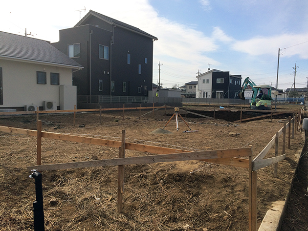 建物の位置、基礎の高さ、水平などを決めるために行うもので、重要な工程です。
