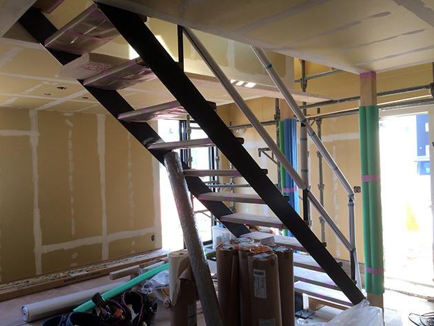 内装塗装とボードのパテ処理を終えて現場ではクロスが貼り進められています。