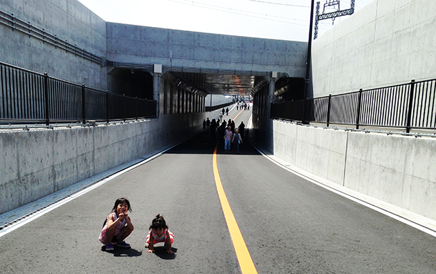 日曜の朝、たまたま散歩がてら娘2人と自転車こいでたら近所の道路のアンダーパス開通式に遭遇しました。
