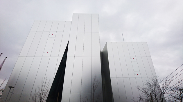 外壁に使われている光輝アルミ合金パネルが風景や空に溶け込み、かなり特殊な形状をした建築ですが街になじむ佇まい(勿論下町を歩いていていきなりこの建築が現れるのは驚きますが)。