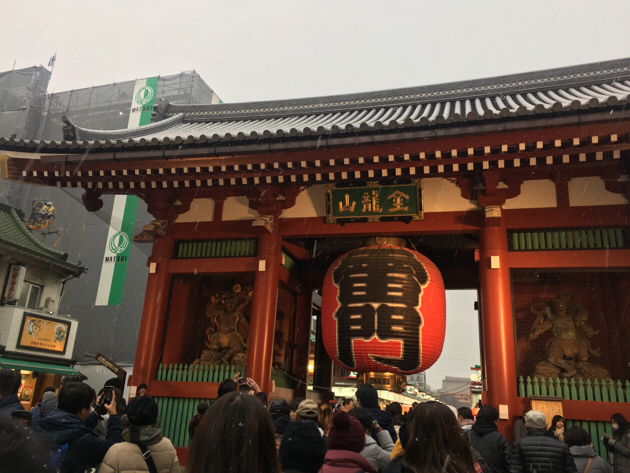 雪の中、約束があったので浅草へ。流石に人も少ないだろうと思いましたが、いつも通りの混雑でした!