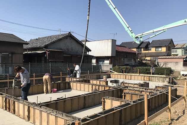 基礎はスラブと呼ばれる底の部分と、土台を乗せる立上りを2回に分けて施工します。