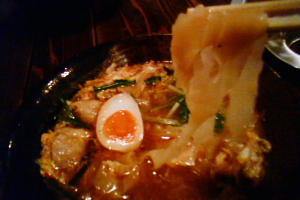 きし麺みたいな幅広麺、うどんのようにも感じますがラーメン。味は、う~ん...。味噌とか醤油という訳でもなく、しいて言えばスーラー...?。