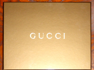 W:200mm H:150mm D:30mm 程度の、黄金色に輝くこのGUCCI(グッチ)の箱の中身は何ぞや?ということでリボンをほどきオープン。