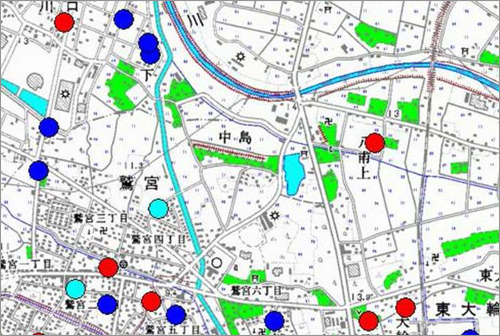 画像の青い●は地盤軟弱判定、水色の●は良好地盤判定、赤い●が改良工事を行った場所です。地盤調査を行う前に、調査会社から周辺データをもらって確認しているので興味があったら気軽にお問合わせください。