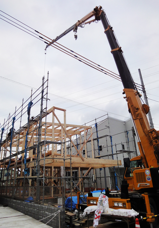 敷地が長く前面に電線があるため初めてピタゴラスというクレーンが出動。