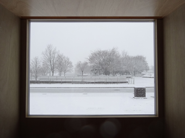 群馬県板倉町のオフィス、打合せスペースには向かいの公園を借景とする窓があります。