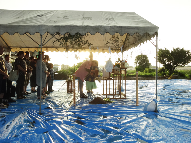 雨がポツポツ降る中での開催となってしまいましたが工務店さんがテント、ブルーシートを用意してくれたので泥んこにならずにすみました。