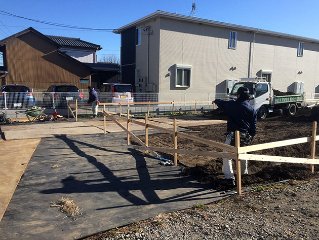写真は遣り方工事の段階です。建物の正確な位置を決める重要な工程です。