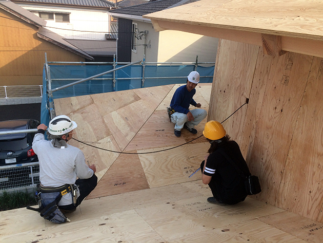 今回規模が大きい+屋根形状が少々複雑+部材が多い、という事などもあり屋根合板が貼られるまで4日を要しました。