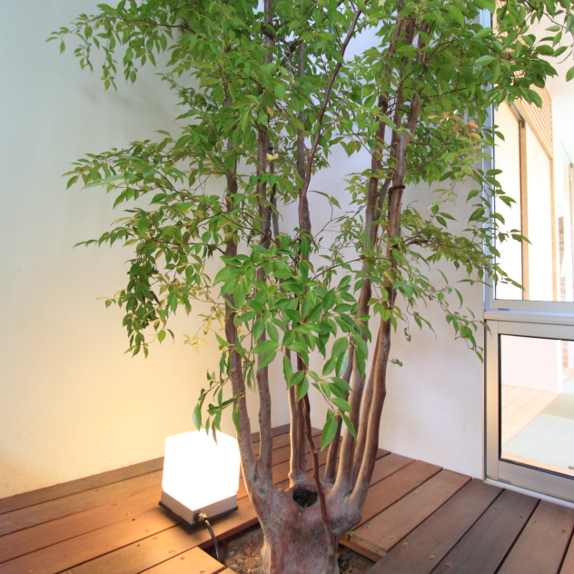 小上がりの畳スペース、バスルーム、トイレから見える坪庭の植木。