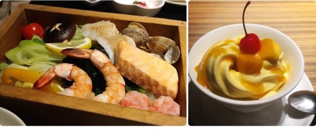 食事は海鮮のセイロ蒸しとマンゴーアイス。