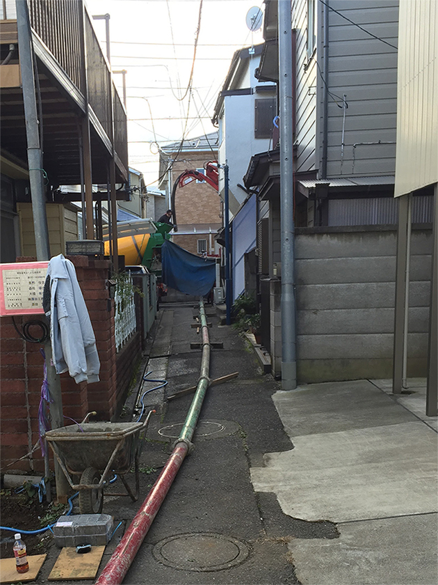 今回は前面道路が狭くポンプ車が入らないため、広い道路より配管して圧送します。