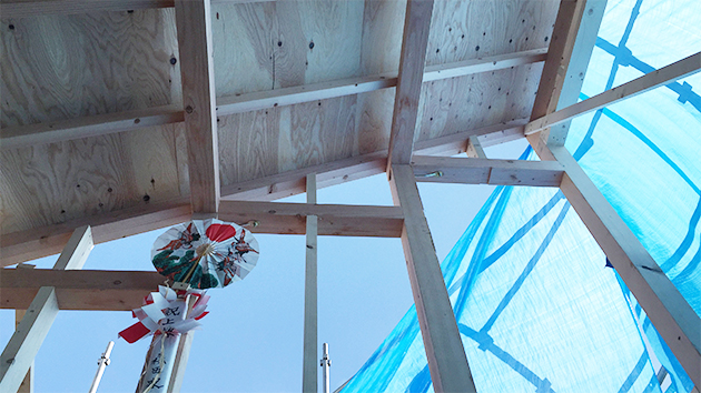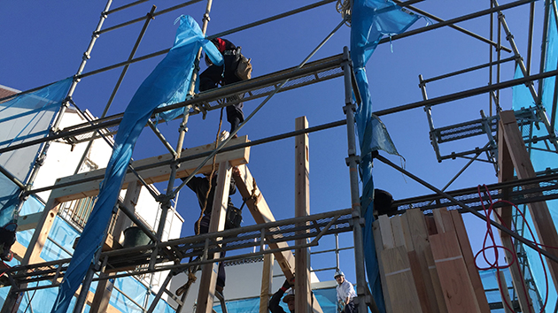 もちろんクレーンも無いので梁を掛けるのも手作業。