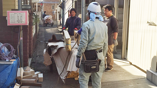 基礎工事の時にもお伝えしましたが、敷地に車が入らないため材料は途中からすべて台車で搬入します。