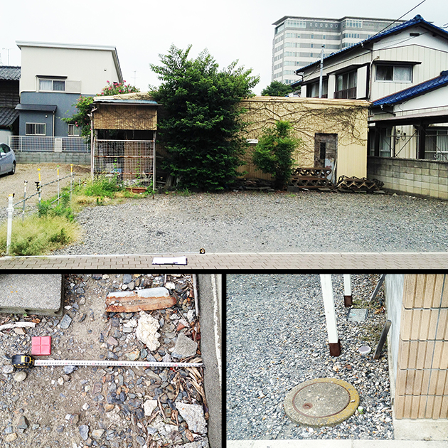 他にも公図と照らし合わせて測ったり、杭、上下水やガス引込があるか、解体予定の小屋の状態などチェックチェックです。