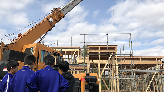 タイミングよくクレーンの作業中で、現場の迫力を感じてもらうことができました。