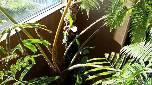 新芽をどんどん展開しているヒカゲヘゴさんですが枯れてしまってマザーとなっている部分があります。