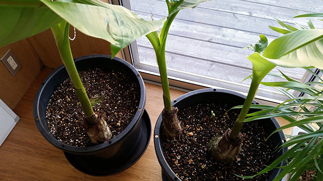 事務所の外にあったバナナの木(バナナの葉)を室内に移動しました。