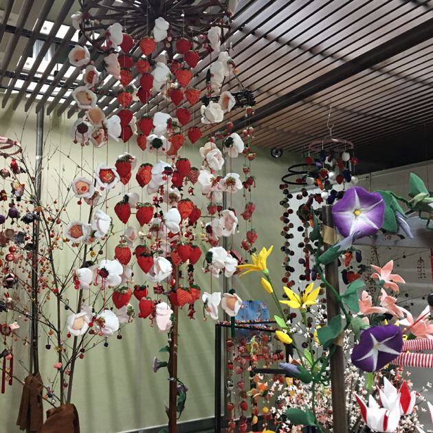 週末、実家に帰ると新幹線の駅につるし雛というものが。