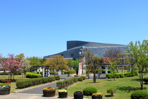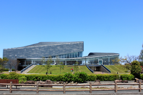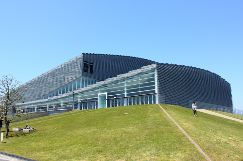 緑の丘の上に建つ建築。先ほどは柔らかいと書きましたが、芝生・緑=『柔』の上に建つガラス・鉄=『硬』のコントラストは良ですね。写真のコントラストも高めです。