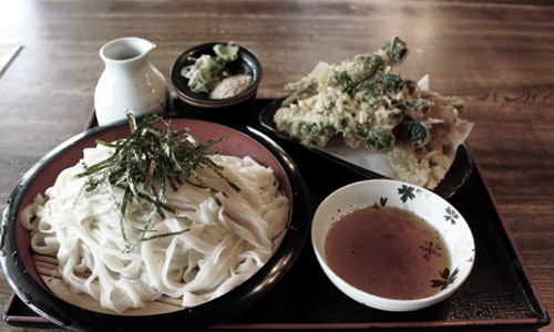 勢いで入ってしまいましたが、お値段はちと高め...。しかし、なかなか来る機会も無いし、ブログにも写真栄えのするものを掲載したい...。ということで山菜天ぷらうどんに決定。