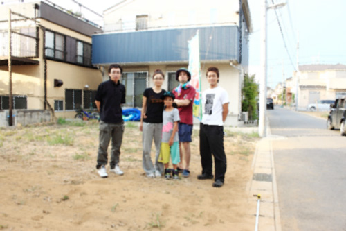 現在のプランだと建物がこの辺りまで、カーポートはこの辺りなどと話をし、敷地で記念写真。竣工アルバムの表紙を飾る予定の一枚です。