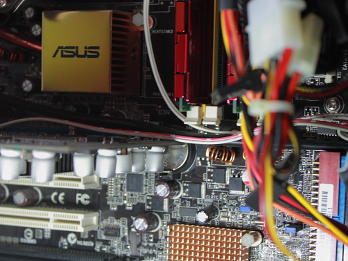 写真中央のボタン電池ちゃんを交換。左手前のグラフィックボードが邪魔でしたが、手先は器用なのでマイナスドライバー使いながら楽々交換。赤いアルミニウムのメモリー用ヒートシンクがオシャレでしょ?(自己満)