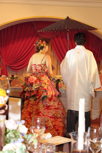 披露宴でのご夫婦の衣装は旦那さんは和装、奥さんはドレス、ん?ミスマッチ?と思いましたが良く良く見るとドレスなんだけど着物のドレス!?初めて見ました。