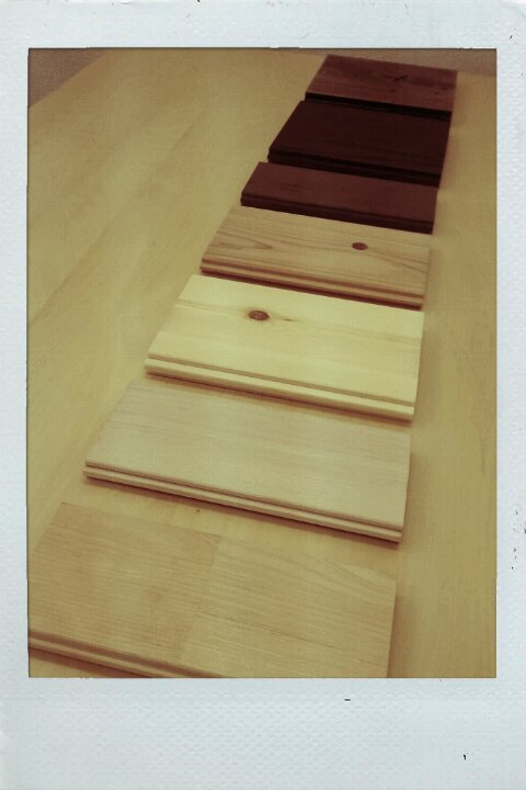 その後は前回フローリング秘伝帳で選んでいただいた実物サンプルを机に並べて選定タイム。