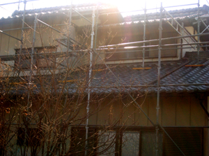 2階の外壁やサッシも新しくするため、工事する職人用の足場を設置しました。